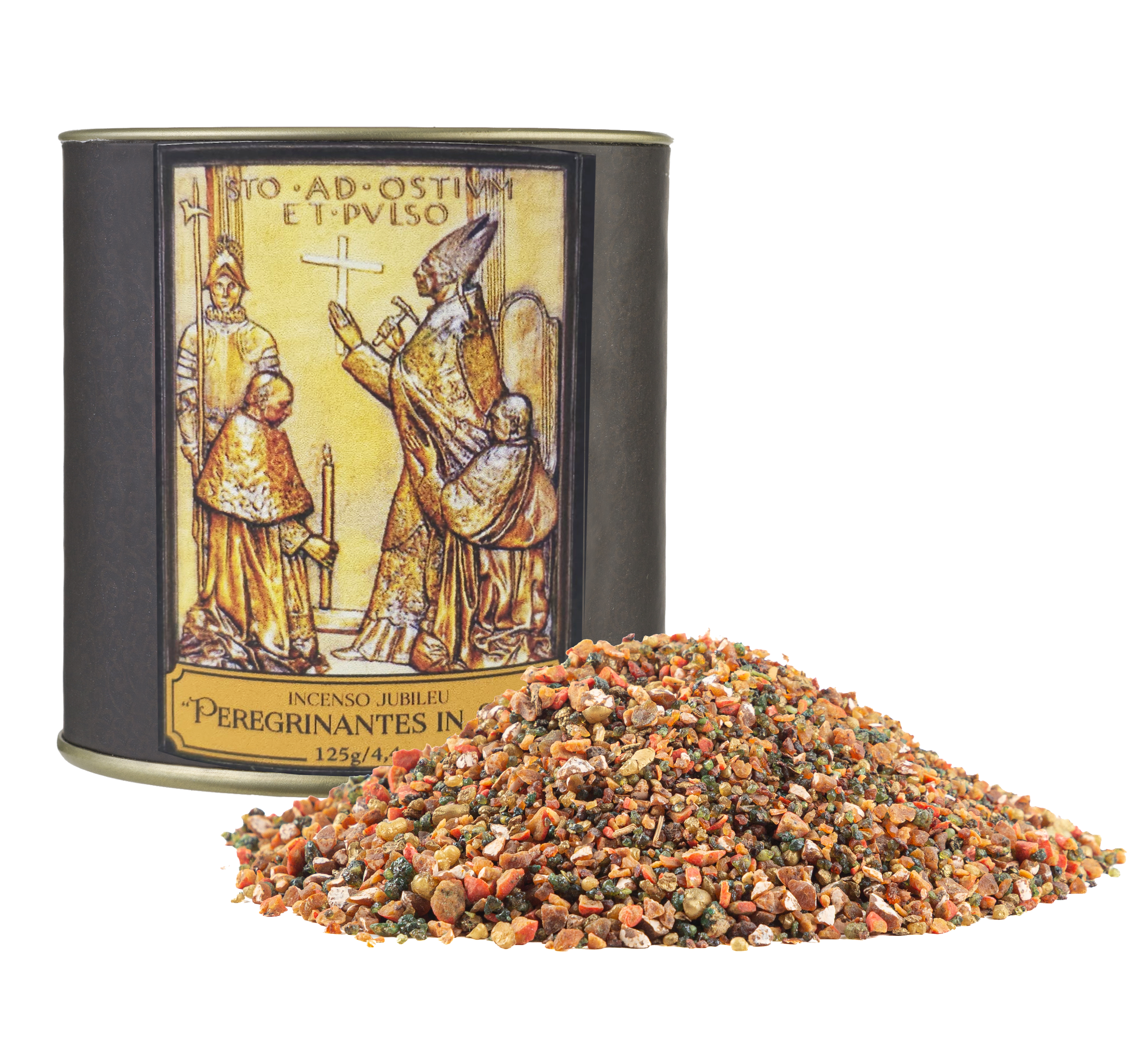 Barrica contendo 125g de incenso Peregrinantes in Spem, o incenso criado pela Milagros especialmente para o Jubileu dos Peregrinos da Esperança.