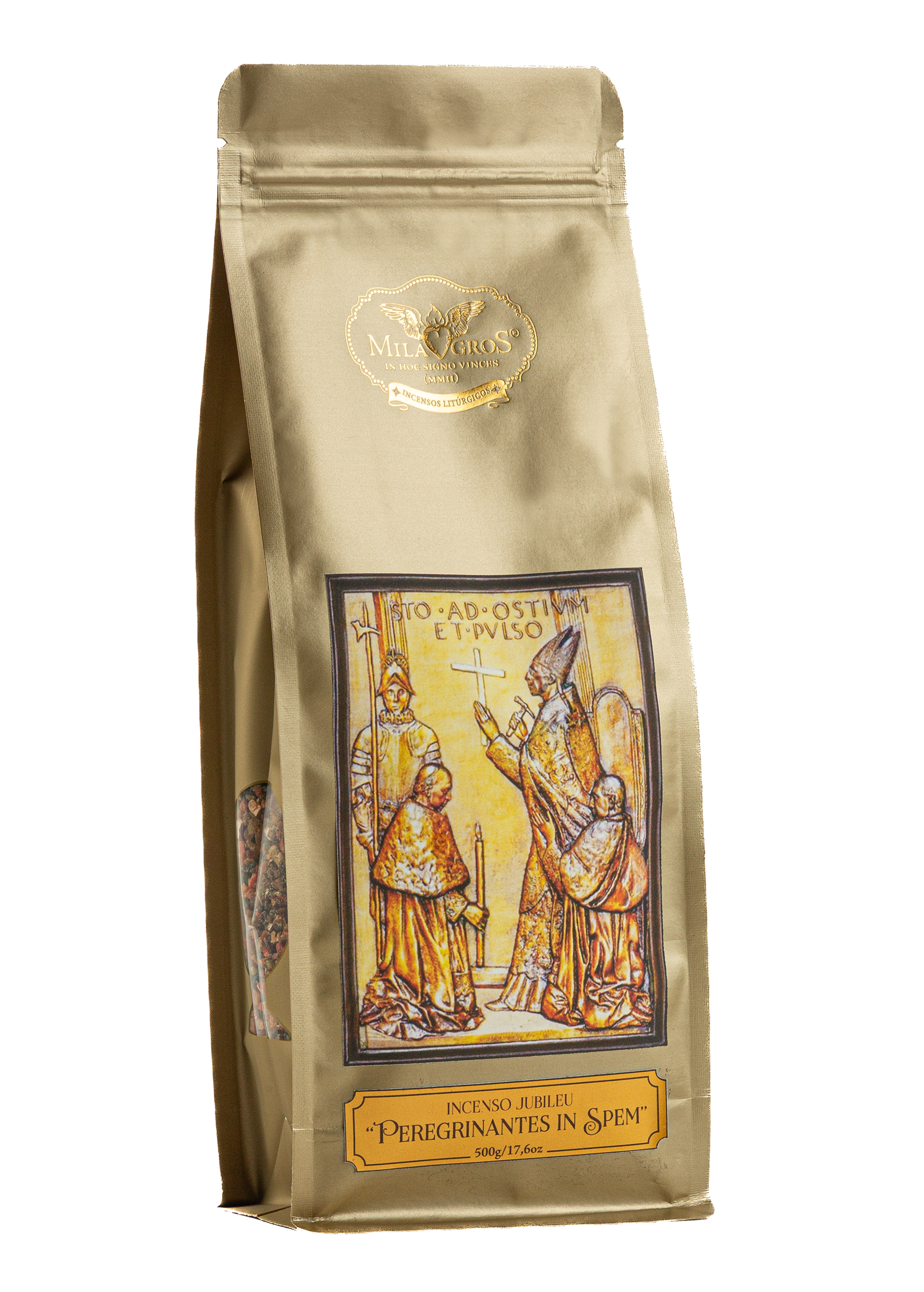Embalagem com fechamento zip contendo 500g de incenso Peregrinantes in Spem, o incenso criado pela Milagros especialmente para o Jubileu dos Peregrinos da Esperança.