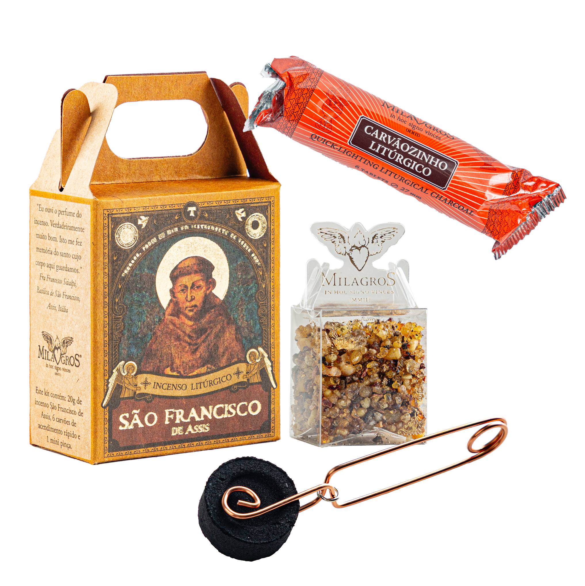 MINI KIT CONTENDO FRASCO DE 20g DE INCENSO SÃO FRANCISCO DE ASSIS + 6 carvões de acendimento rápido + 1 minipinça para manuseio do carvão.